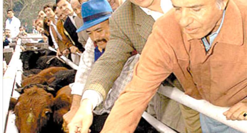Foto histórica: el entonces presidente argentino, Carlos Menem, en abril de 1999, aplicando la última vacuna antiaftosa, unos meses después el país debió reconocer nuevos brotes de la enfermedad y Argentina retrocedió drásticamente en las exportaciones, reportando pérdidas mayores a los 2000 mill/dol. NOTICIAS AGROPECUARIAS