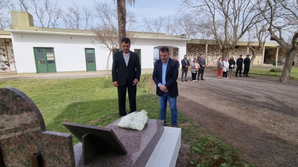 Con motivo de conmemorarse ayer el 126° aniversario de la fundación de Cacharí, se realizó un acto en el Cementerio de la localidad donde el intendente municipal Hernán Bertellys junto al delegado Marcelo Valdez depositó ofrendas florales en los monumentos a los fundadores, Mariano Falomir y Juan Andrade.
