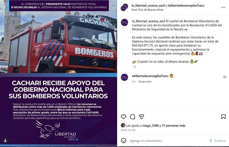 En su publicación, La Libertad Avanza Azul afirmaba que el cuartel de Bomberos de Cacharí era uno de los beneficiados por este aporte, aspecto que fue aclarado por la institución bomberil. Según señalaron, los fondos mencionados corresponden a los años 2025 y 2026, no han sido depositados aún en su cuenta y no corresponden a un aporte extra, como se indicó en la publicación de la agrupación política.