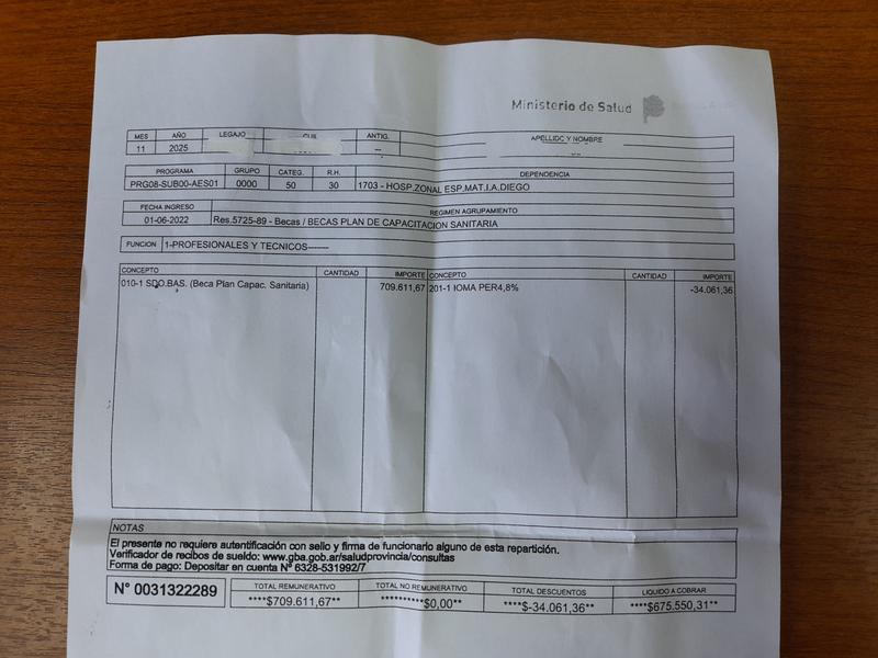 El recibo de sueldo de un enfermero profesional que trabaja como becario en el nosocomio zonal que funciona en esta ciudad.