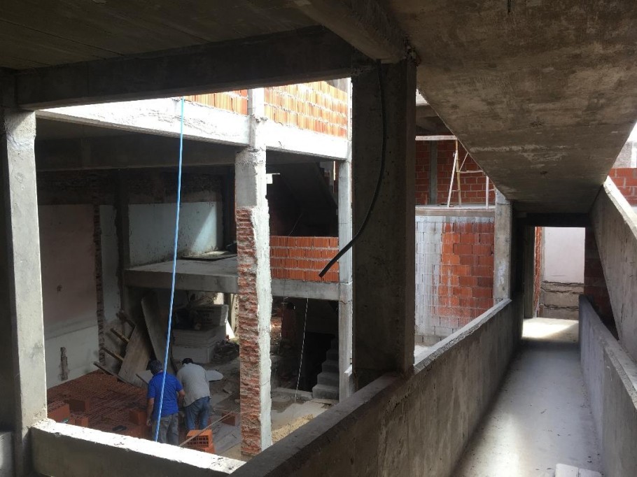 Obreros trabajando en el interior del edificio que está construyendo Galli sobre la Avenida Perón, frente a Tribunales.
