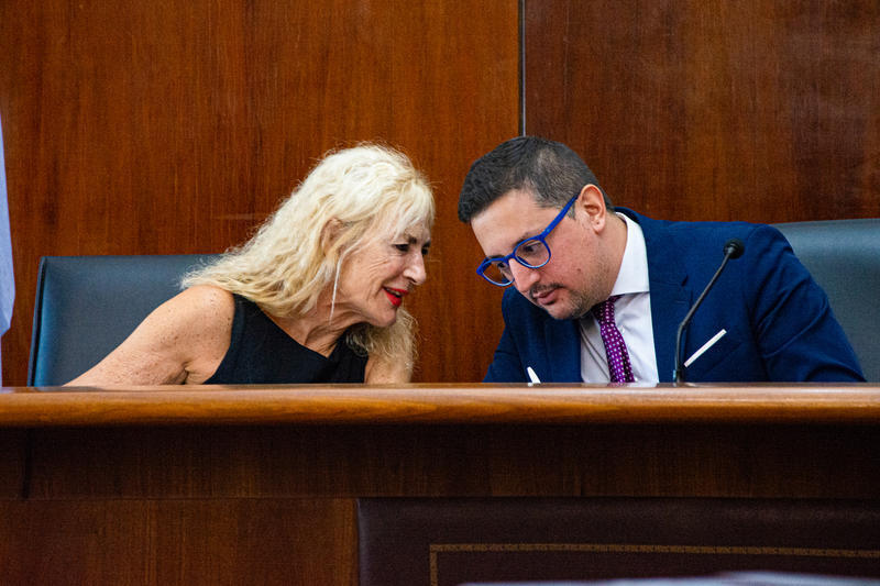 Los jueces del Tribunal 2 Alejandra Raverta y Albano Gallicchio, dialogando durante la audiencia desarrollada anteayer.