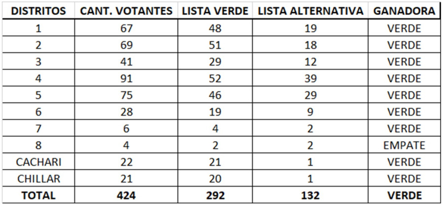 Los resultados por distrito fueron favorables a la lista oficial, la lista verde "Compromiso y Participación", con un total de 292 votos a favor (69 %) y 132 para la lista alternativa (31 %).