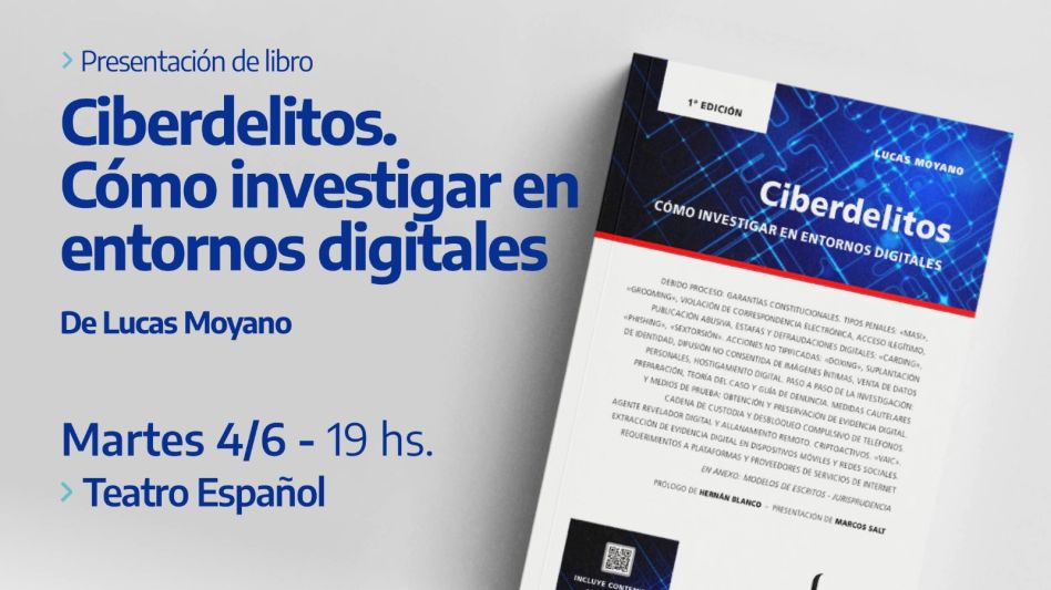 El Municipio de Azul invita a la presentación del libro "Ciberdelitos. Cómo investigar en entornos digitales", de Lucas Moyano. La misma será el martes 4 de junio a las 19, en el Teatro Español.