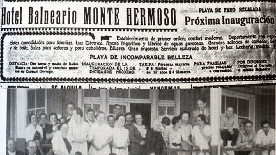 "En 1937 las tierras de Monte Hermoso que pertenecían al partido de Bahía Blanca son recuperadas por Coronel Dorrego y, ese año, en los festejos del cincuentenario del partido, se inaugura el balneario de Monte Hermoso y comienza a planificarse lo que sería un pueblo, ya que hasta ese momento tenía solamente casillas y el Hotel de Madera, que estaba todavía en una época de oro, ya que en los '40 y principios de los '50 todavía tenía su aspecto señorial, pero después el avance de la arena y la aparición de otros hoteles y la extensión del ejido urbano le hizo perder vigencia", repasa Barda.