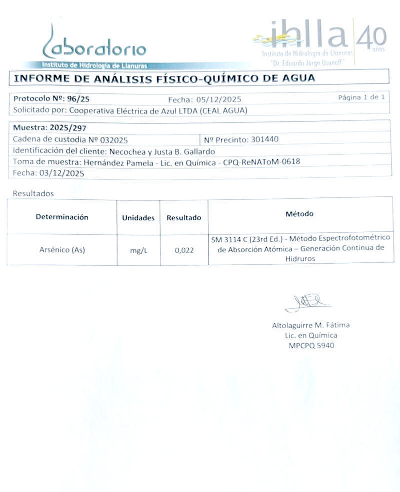 Un reclamo presentado por una vecina de la ciudad de Azul volvió a encender las alarmas sobre la calidad del agua potable que se consume en distintos sectores de la localidad. Marianela Bianchi, domiciliada en nuestra ciudad, hizo pública una denuncia dirigida a la Cooperativa Eléctrica de Azul, en la que expuso resultados de análisis de laboratorio que indican niveles de arsénico por encima de los valores permitidos para el consumo humano. Desde la CEAL, en tanto, se confirmó que el agua potable de Azul cumple con las normas y cuestionó la validez de estudios difundidos en redes sociales.